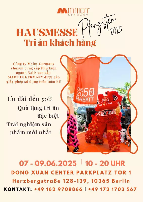 Nhân dịp lễ Pfingsten, công ty Maica Germany trân trọng kính mời Quý khách đến tham dự HAUSMESSE BERLIN 2025 – chương trình tri ân khách hàng hằng năm được tổ chức tại Trung tâm Thương mại Đồng Xuân, Berlin.