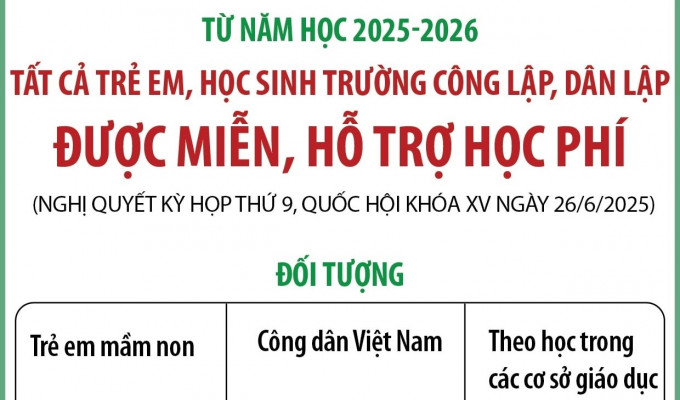 Theo đó, kể từ năm học 2025-2026, tất cả trẻ em mầm non, học sinh phổ thông, người học chương trình giáo dục phổ thông là công dân Việt Nam hoặc người gốc Việt Nam chưa xác định được quốc tịch, đang sinh sống tại Việt Nam và theo học trong các cơ sở giáo dục thuộc hệ thống giáo dục quốc dân sẽ được miễn hoặc hỗ trợ học phí.